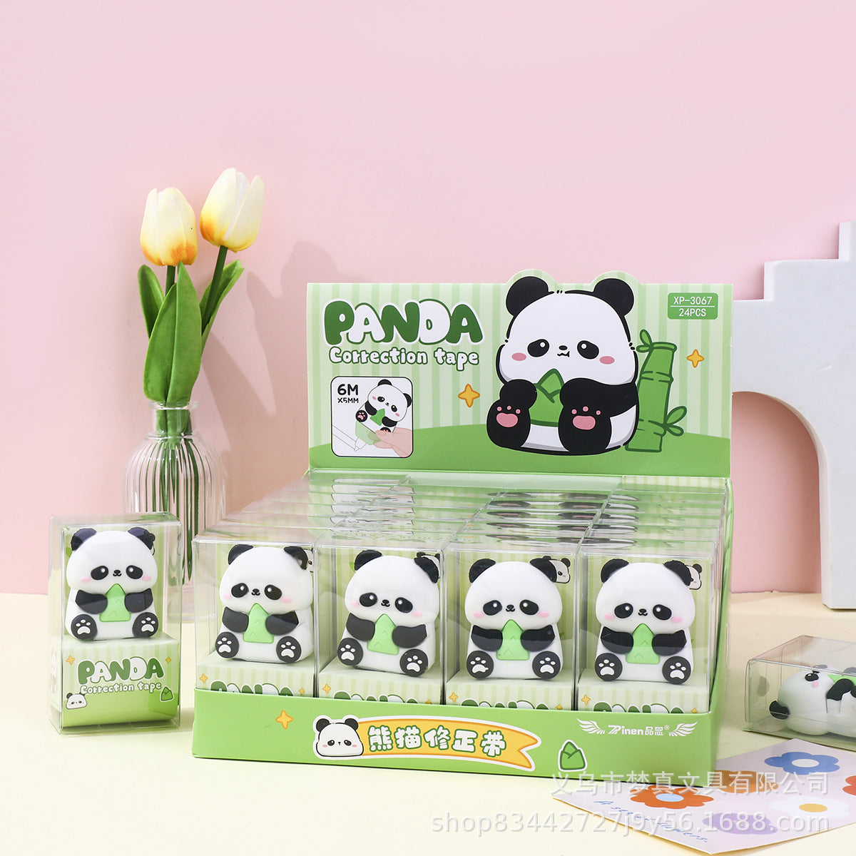 Este corrector en cinta tiene una cubierta de goma con un panda redondito y sentadito, super tierno y kawaii. Perfecto para tu escritorio o estuche.
